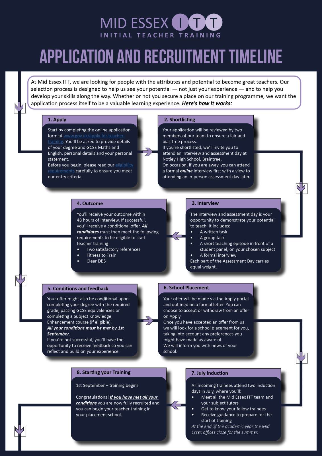 We have created the below graphic which sets out the process in a clear and simple, step-by-step way. We hope this will give potential candidates a really good idea about what should be happening, and when!