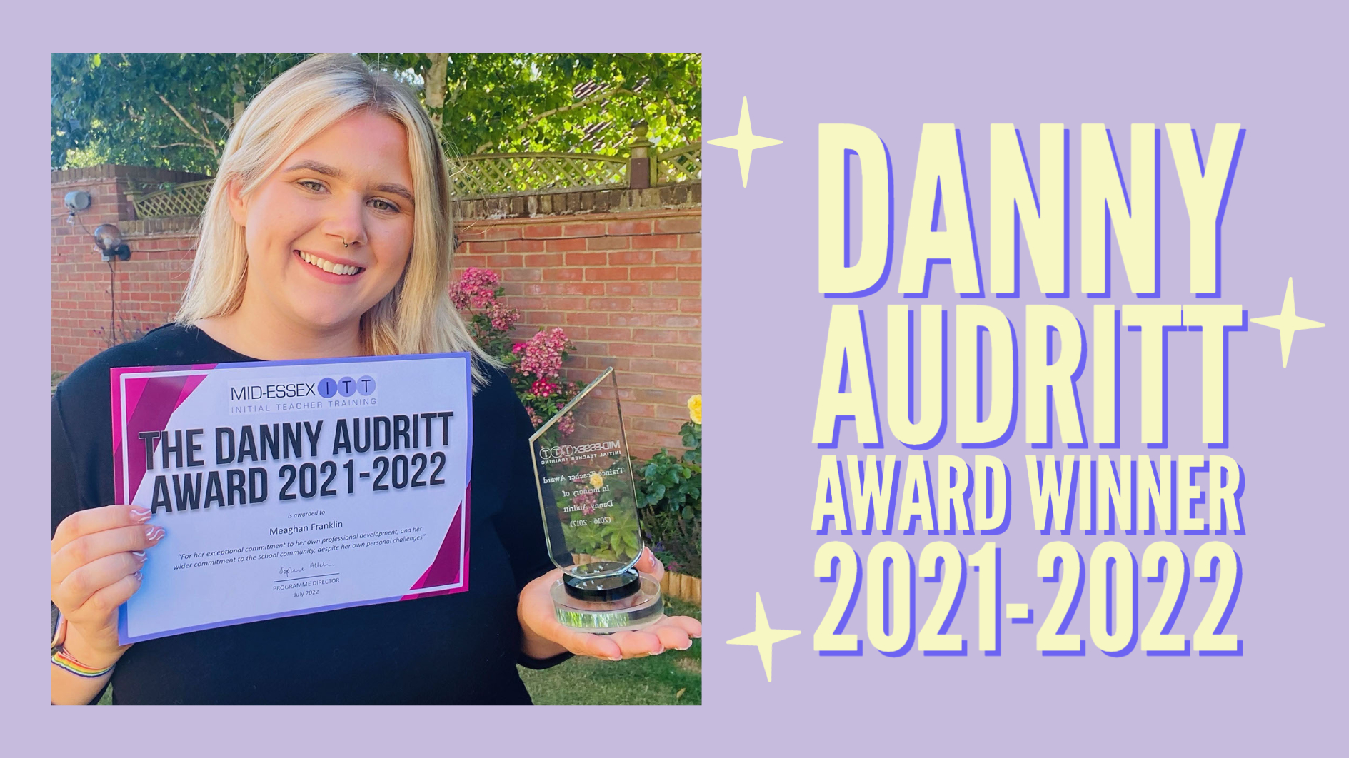 This year, the trainee chosen to receive the award in memory of Danny is Meaghan Franklin, a history teacher who completed with MEITT at Hylands School.