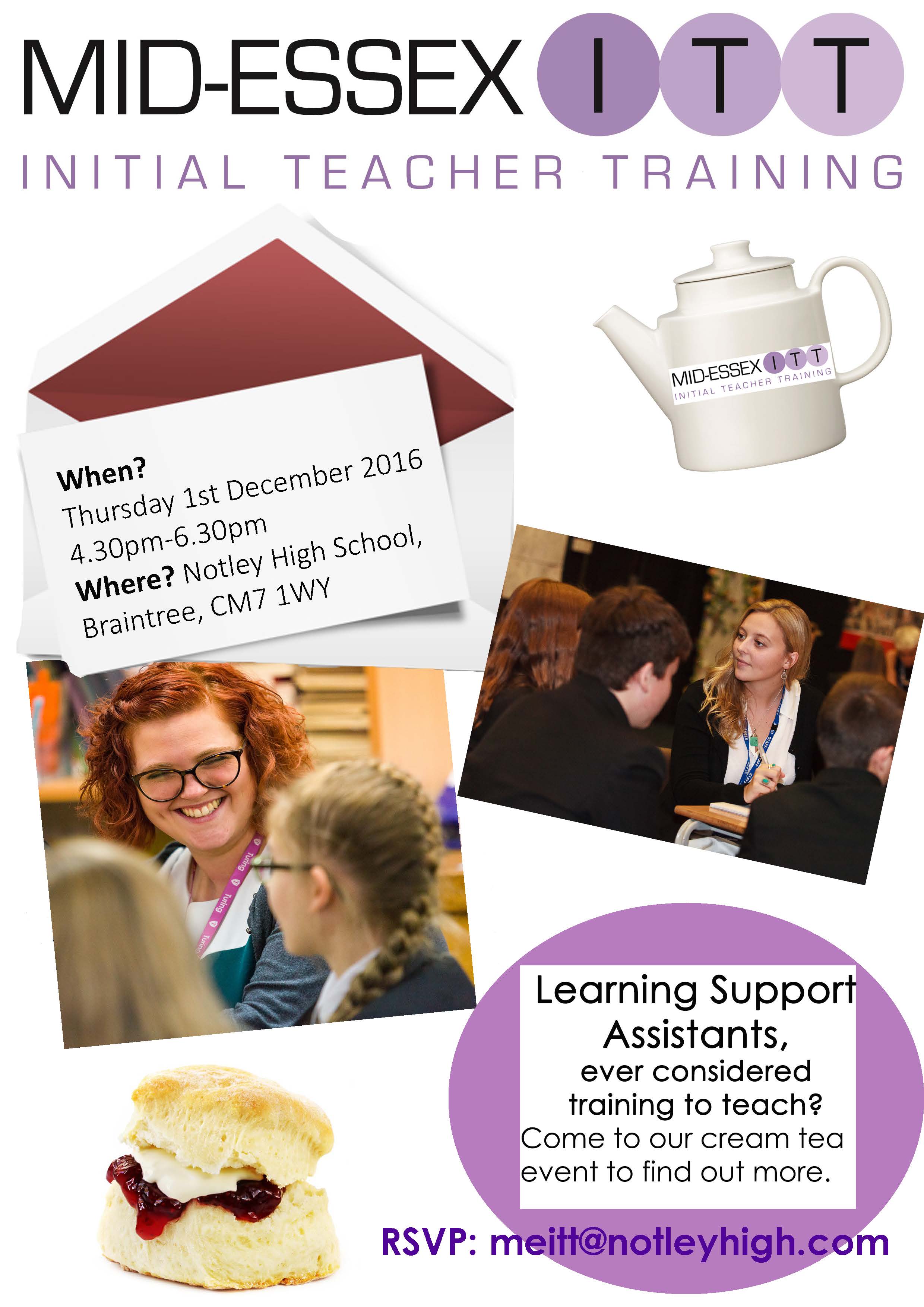 If you are interested in becoming a teacher and have experience working as an LSA, cover supervisor, TA or learning mentor, we'd like to invite you to our cream tea event hosted at Notley High School and Braintree Sixth Form on Monday 1st December 2016 at 4.30 pm - 6.30 pm.